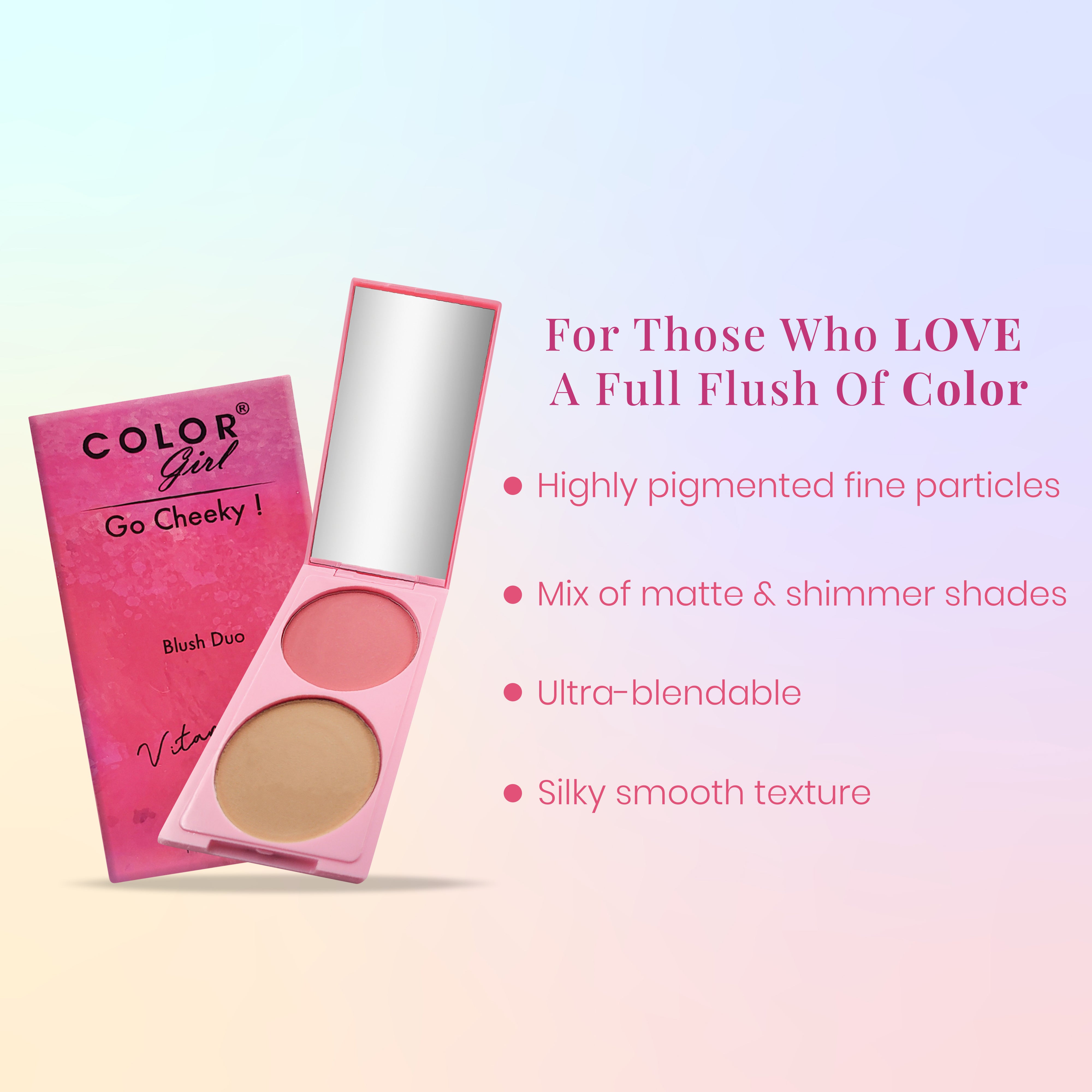Add a touch of radiance to your makeup routine with the Color Girl Go Cheeky Blush Duo (9g, Beige & Pink). This super-finely milled compact powder and blush combo feels as soft as cashmere on your skin, blurring imperfections and delivering a flawless, soft-focus finish.